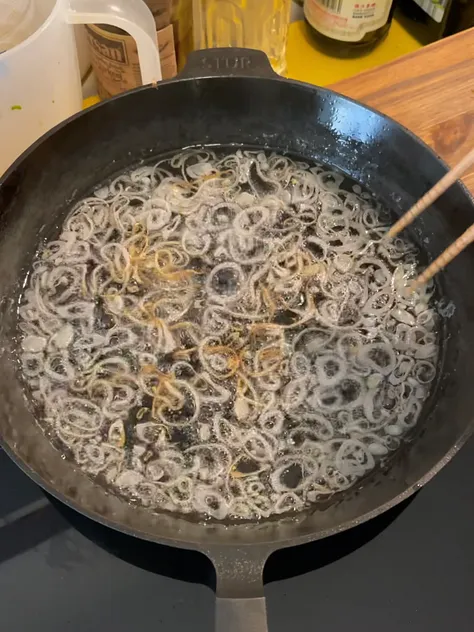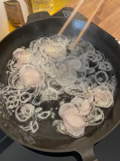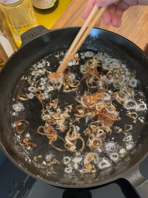Zum Glück braucht man für Schalotten nicht viel Öl. Sie lassen sich nämlich wunderbar frittieren, ohne dass du einen halben Liter Öl aufwärmen musst. Einfach in eine gusseiserne Pfanne ca. 1 cm tief Öl geben und los geht’s. Und das Beste? Das Öl, in dem die Schalotten frittiert wurden, muss danach nicht gleich entsorgt werden. Es eignet sich nämlich perfekt für Shallow Frying. Dabei liegt das Essen nur teilweise im Öl und wird flach angebraten, anstatt darin zu schwimmen wie beim klassischen Frittieren. So sparst du nicht nur Öl, sondern verleihst dem nächsten Gericht auch noch diesen extra aromatischen Geschmack, den das Öl von den Schalotten mitbekommen hat. Doppelt praktisch und super lecker.