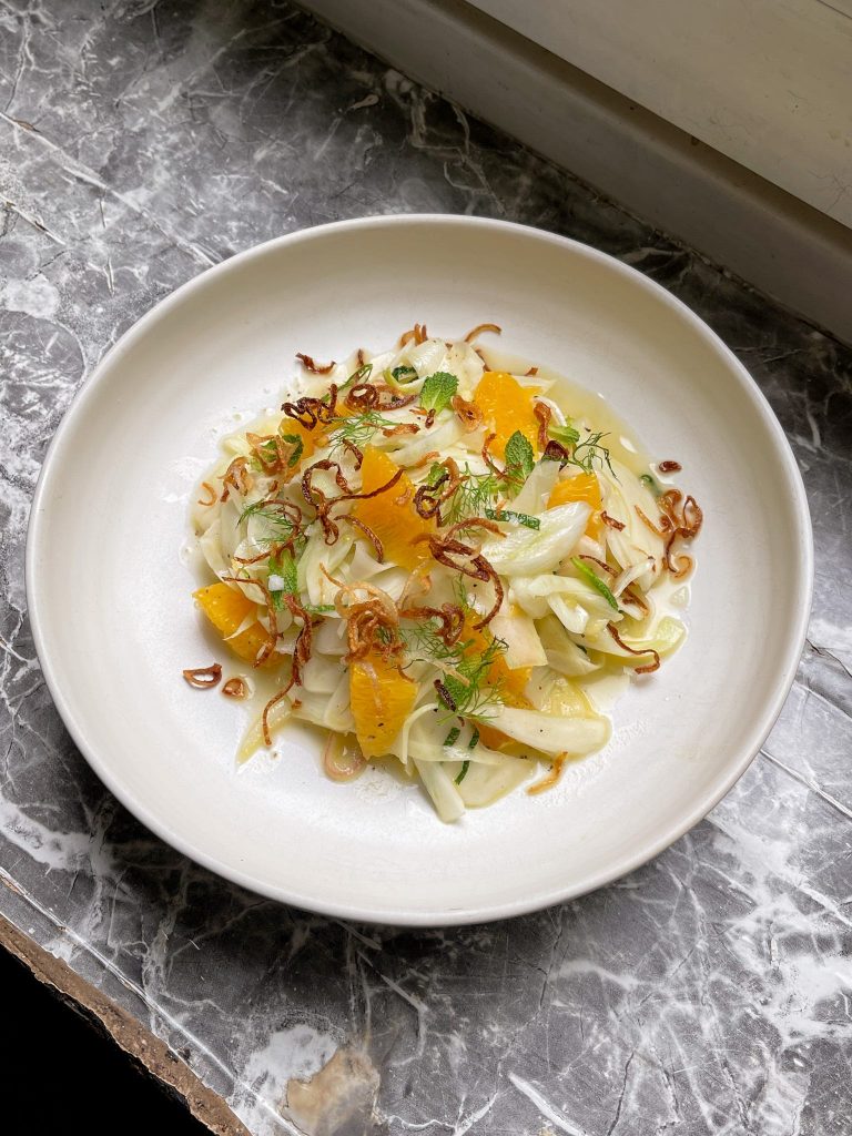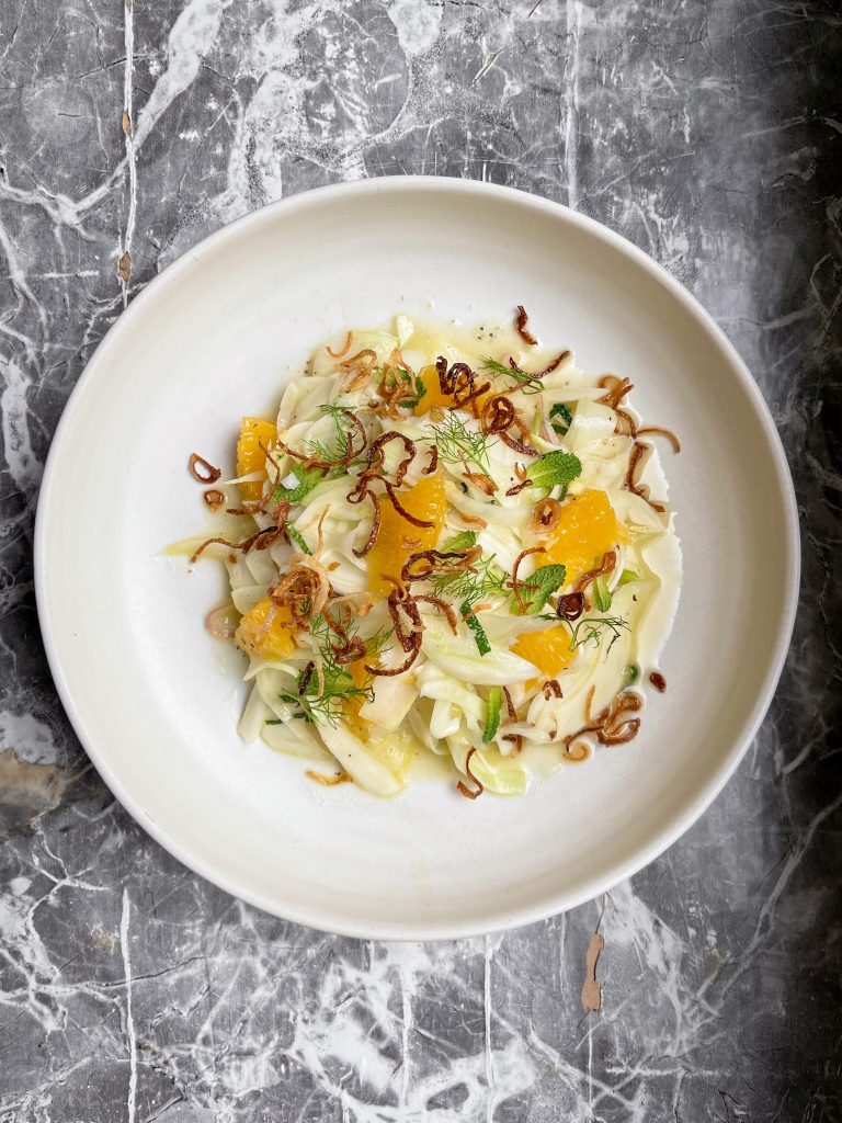 Fenchelsalat mit Orangen und frittierten Schalotten